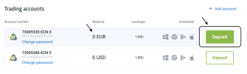 Na hlavní stránce své členské zóny vyberte možnost "Vklad" vedle obchodního účtu v EUR, který jste si vytvořili. Je velmi důležité zvolit správný účet. Poté vyberte způsob, jakým chcete účet vložit, a proveďte platbu.